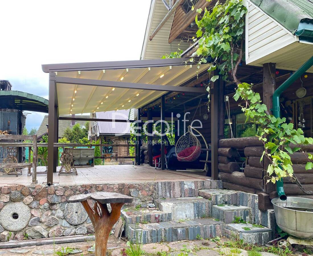 Крыша перголы, сделанная из специального полотна, раскладывается или складывается, в зависимости от погоды. Настраивать конструкцию можно автоматически, подавая команды на расстоянии. Пергола отлично защищает от солнца и осадков, помогает всегда поддерживать комфортный микроклимат.