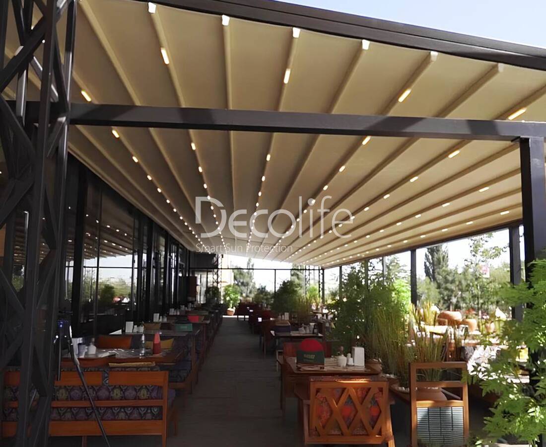 Тентовая пергола Decolife Basic&Pro New, реализовано партнером "TENT VERTEX" - г. Алматы, чайхана "Navat"