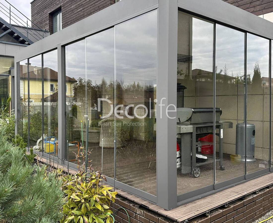 Остекление может включать различное число створок – до 12 штук. Системы универсальны, подходят для небольших и просторных площадок, для пространств любой планировки и назначения, для пергол Decolife. Значительные нагрузки, влажность и другие негативные факторы не наносят конструкции вреда, благодаря использованию специальных материалов для ее изготовления.