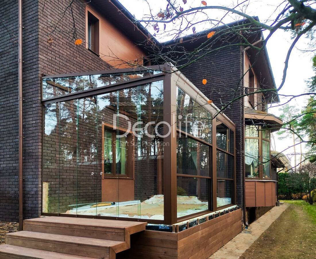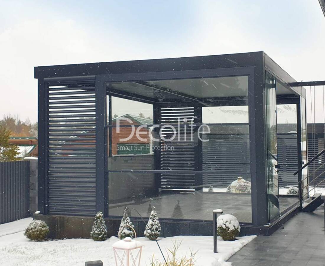 Пергола Decolife B600 PIR + Фасадные жалюзи FZ-44 + Гильотинное W500 и раздвижное S200 остекление - г. Минск